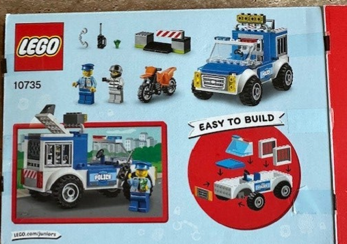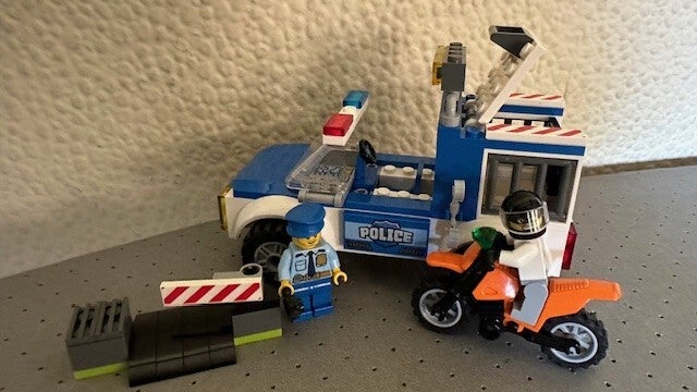 Kom bij de politie van LEGO® City: ga op boevenjacht en arresteer de inbreker. De set bestaat uit eenvoudig te bouwen modellen zoals een politietruck met cel, een wegversperring met beweegbaar hek en een motor voor de boef. Er hoort ook een juweel-element bij.