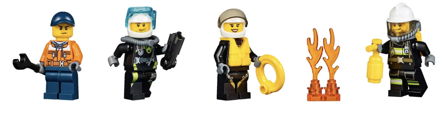 - Inclusief 4 minifiguren: 2 brandweermannen, een brandweervrouw en een dokwerker