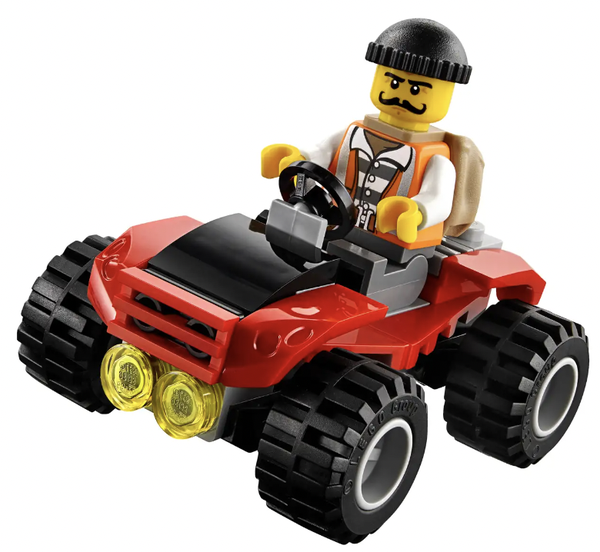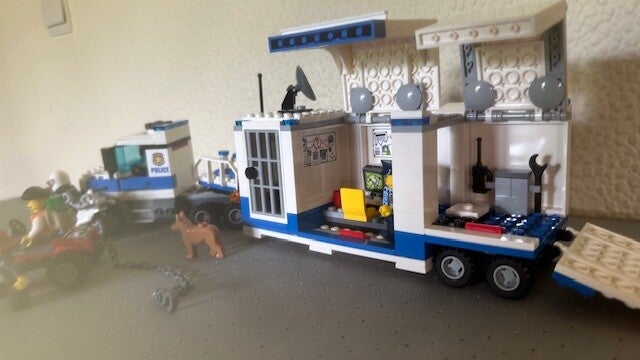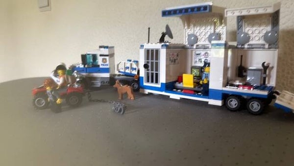 De set is inclusief truck met afneembare cabine, plaats voor twee minifiguren, commandoruimte met beeldschermen, schotelantenne, dak, zijdeuren en hellingbaan die kunnen worden geopend, ruimte voor de motor, gereedschap en cel met uitbreek-functie plus de quad van de boeven. Inclusief vier minifiguren: twee politieagenten en twee boeven, plus een politiehond-figuurtje.