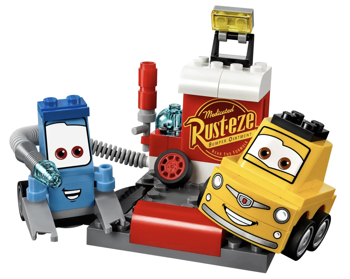 Bedenk je eigen Disney•Pixar Cars 3 race-avonturen met Guido en Luigi's pitstop inclusief luchtslang, benzineblik en reservewiel als accessoire-elementen en een pitbord met het nummer 95.