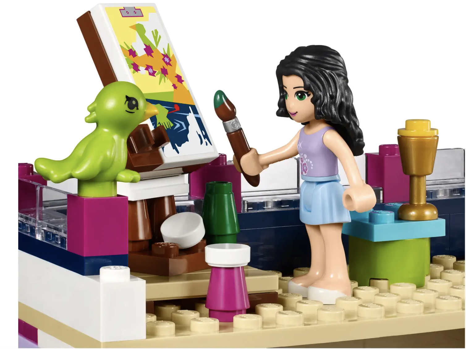 Bouw je eigen moderne droomhuis! In LEGO® Friends Emma’s huis herken je het creatieve talent van Emma’s familie. In de moderne keuken kunnen heerlijk maaltijden worden bereid met de verse groenten uit eigen tuin en met wat er te vinden is in de koelkast met deur die open kan. De hele familie kan in de woonkamer een film zien op de grote, moderne tv met plat scherm.