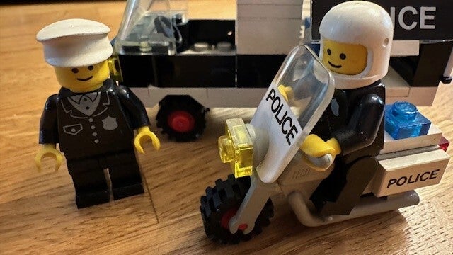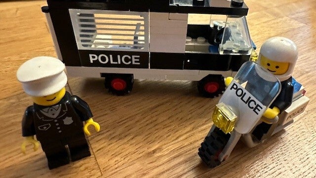 Deze set bevat een politiebusje, een motorfiets en twee politieagenten. De bus heeft een zitplaats in het achterdeel, die toegankelijk is door het dak met de zijwand te kantelen of door dubbele achterdeuren te openen.