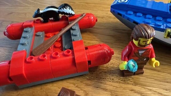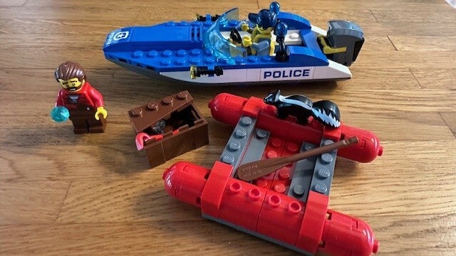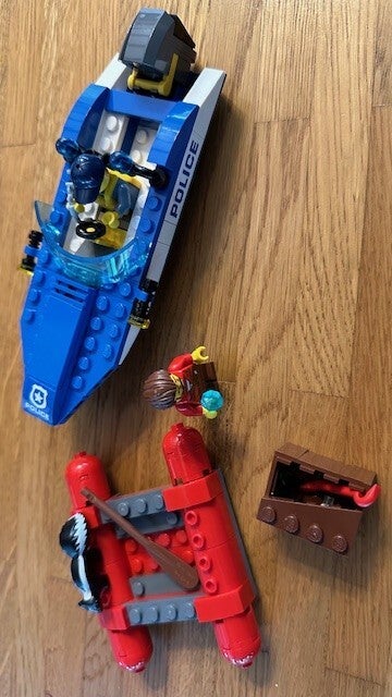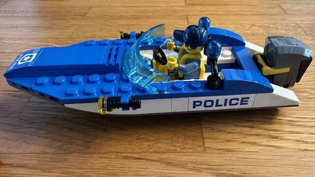 - Omvat een politiespeedboot met grote buitenboordmotor en zwaailichten, plus een vlot met grote drijvers, een peddel en een doos die open kan.