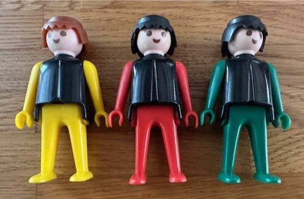 een zwarte trui in combinatie met rode, gele of groene armen en benen,