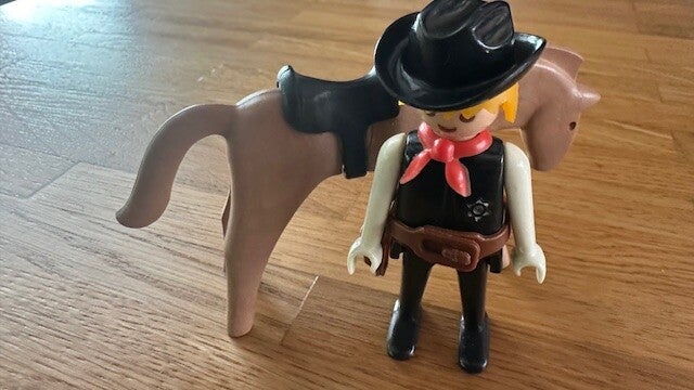 paard met zadel, sheriff met hoed, sjaaltje revolverhouder en revolver