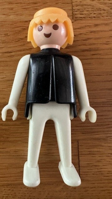 man met geel haar, roze gezicht, zwarte trui, witte armen, handen, benen en voeten